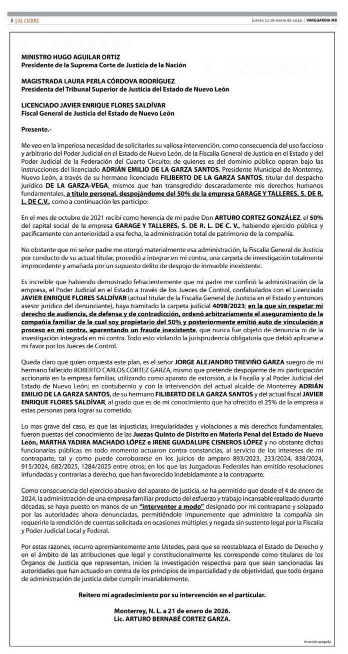 Me veo en la imperiosa necesidad de solicitarles su valiosa intervención, como consecuencia del uso faccioso y arbitrario del Poder Judicial en el Estado de Nuevo León, de la Fiscalía General de Justicia en el Estado y del Poder Judicial de la Federación del Cuarto Circuito; de quienes es del dominio público operan bajo las instrucciones del licenciado ADRIÁN EMILIO DE LA GARZA SANTOS, Presidente Municipal de Monterrey, Nuevo León, a través de su hermano licenciado FILIBERTO DE LA GARZA SANTOS, titular del despacho jurídico DE LA GARZA-VEGA, mismos que han transgredido descaradamente mis derechos humanos fundamentales, a título personal, despojándome del 50% de la empresa GARAGE Y TALLERES, S. DE R.L. DE C.V.. como a continuación les participo:En el mes de octubre de 2021 recibí como herencia de mi padre Don ARTURO CORTEZ GONZALEZ, el 50% del capital social de la empresa GARAGE Y TALLERES, S. DE R. L. DE C. V., habiendo ejercido pública y pacíficamente con anterioridad a esa fecha, la administración total de patrimonio de la compañía.