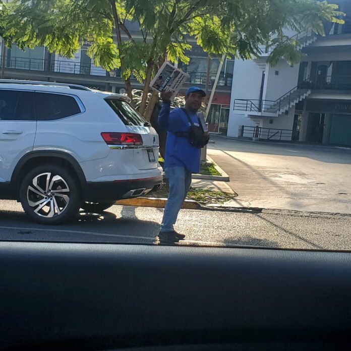 Visto desde el otro lado de la calle. Por la avenida de los industriales. Pleno eje central de la parte fina de San Pedro Garza García. Mientras los trasnochados llegan a casa. Ofrecer el producto prioritario. Edición dominical del periódico.