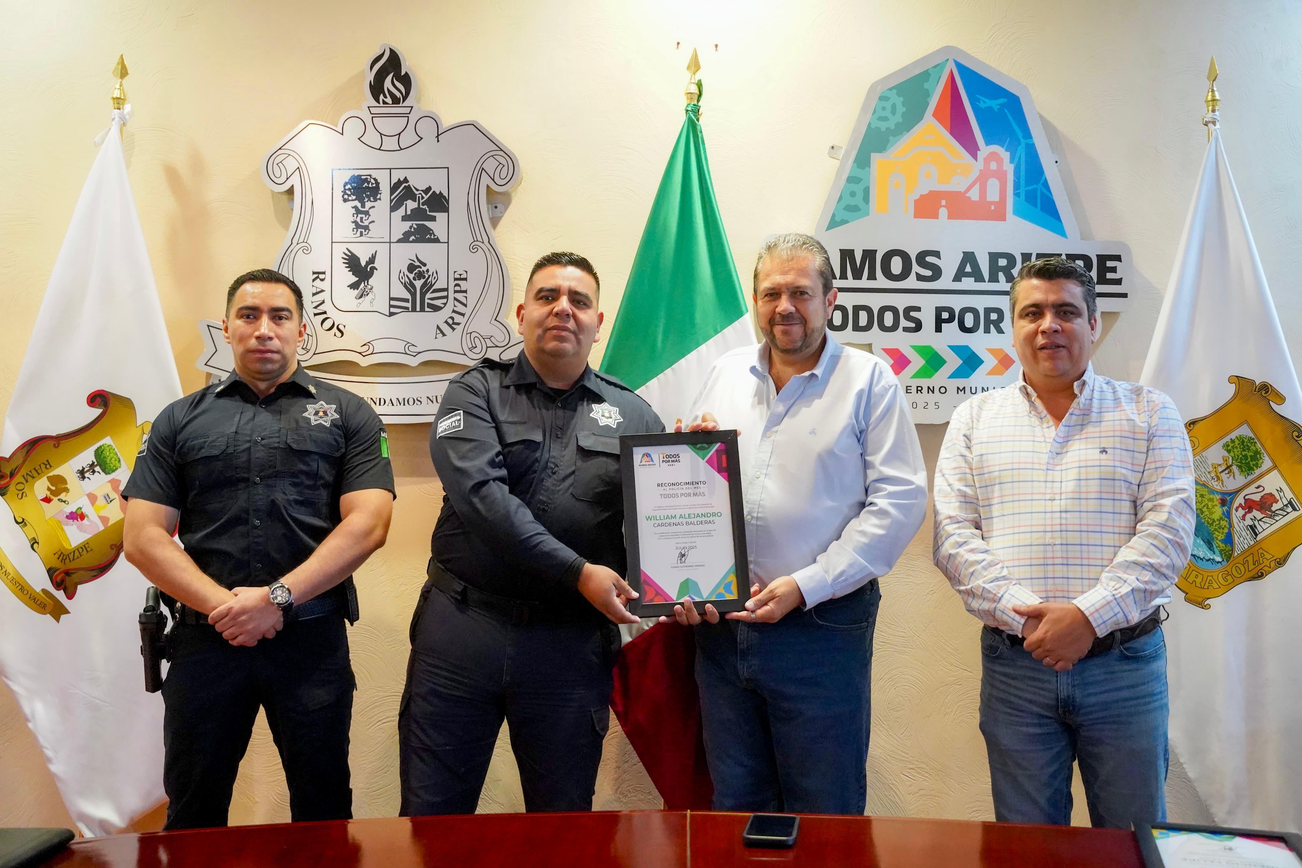 Acompañado por el secretario del Ayuntamiento, Alejandro González Farías, y el director de Seguridad Pública, Rolando Álvarez Flores, el Edil entregó los reconocimientos que incluyen también un estímulo económico, como muestra de apoyo al compromiso, la disciplina y la vocación de servicio de los oficiales en beneficio de la comunidad ramosarizpense.