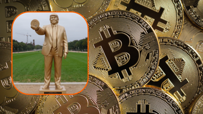 El homenaje realizado muestra al presidente de Estados Unidos sosteniendo un bitcoin. De acuerdo con ellos, la estatua es de oro.