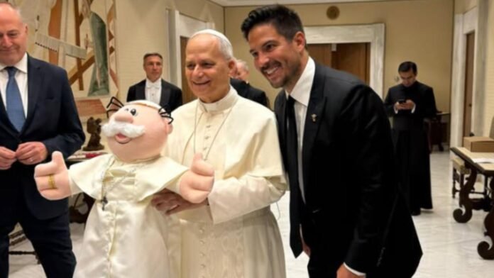 González Herrera publicó una serie de fotografías donde se observa junto al Papa León XIV en la entrega un Dr. Simi grande, caracterizado con la característica sotana blanca.