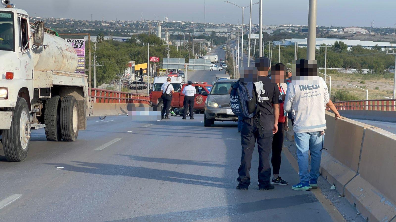 PIEDRAS NEGRAS, COAH.- La mañana de ayer jueves se registró un trágico accidente vial sobre el puente Constituyente Manuel Cepeda Medrano, en el bulevar República, a la altura de Villa de Fuente, donde un motociclista perdió la vida tras ser arrollado por una pipa de agua propiedad del municipio de Piedras Negras.