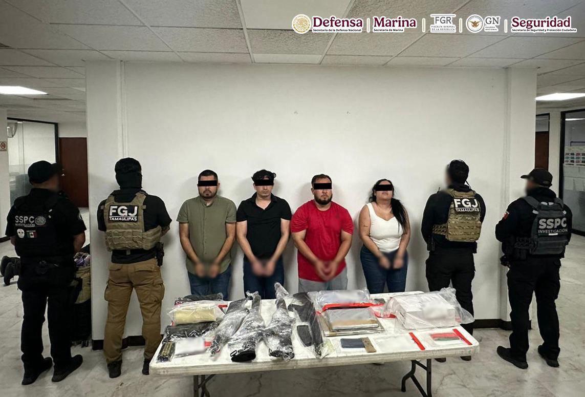 En el operativo, los elementos de seguridad se desplegaron de forma simultánea, “para ejecutar las órdenes de cateo en las colonias Jesús Vega Sánchez y Moderno, donde fueron detenidos cuatro presuntos integrantes de la célula criminal, incluida Juana María ‘N’, relacionada con tráfico de armas y narcóticos, así como lavado de dinero”.