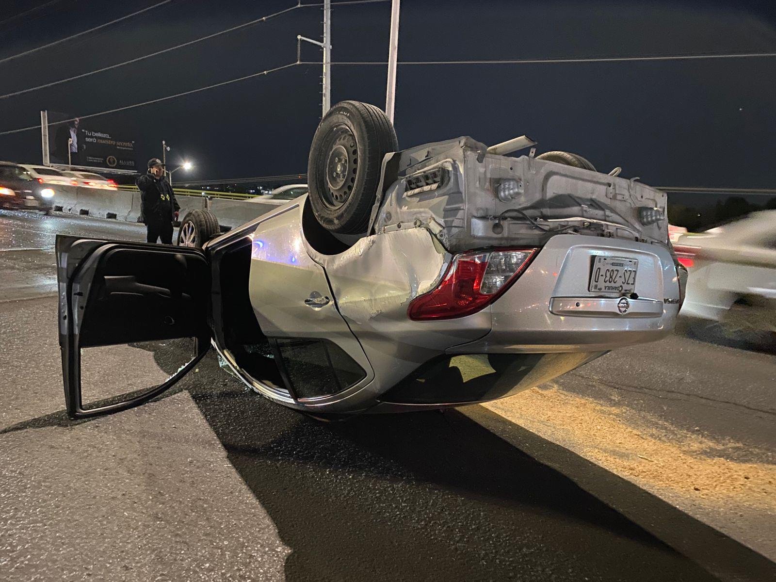 Momentos de pánico vivieron un hombre y su acompañante la tarde-noche de este lunes, luego de protagonizar un aparatoso accidente que terminó en volcadura sobre el puente del Periférico Luis Echeverría Álvarez, a la altura del bulevar Felipe J. Mery, en Saltillo.