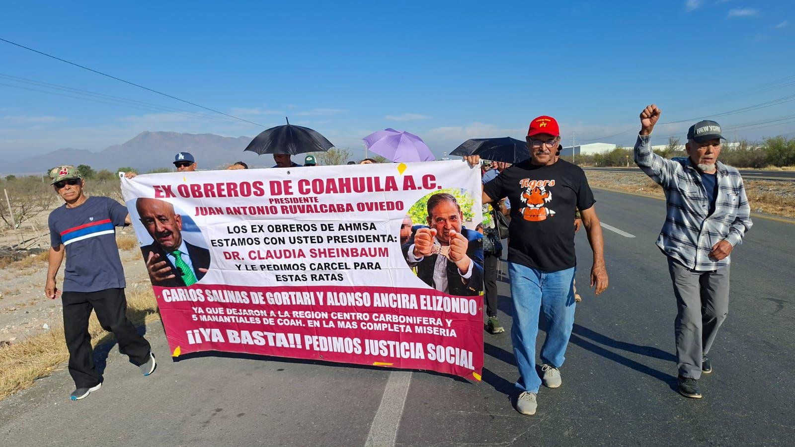 CASTAÑOS, COAH.- A paso constante y con la determinación de exigir los finiquitos que reclaman desde hace años, un grupo de entre 70 y 80 ex trabajadores de Altos Hornos de México (AHMSA) continúa su marcha rumbo a Saltillo.