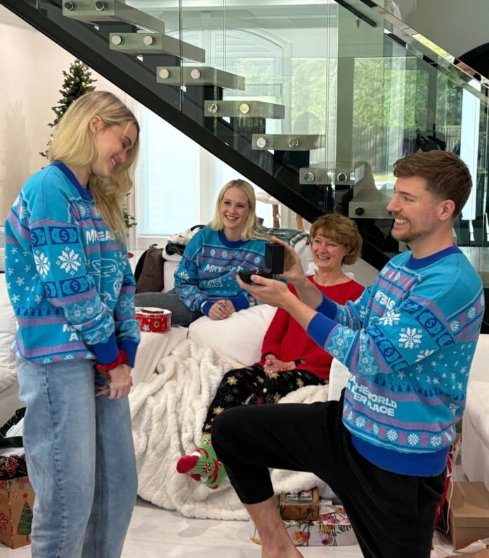 Mientras la pareja se encontraba en la intimidad de su hogar, rodeados de sus seres queridos, a propósito de las festividades de fin de año; MrBeast le hizo la esperada pregunta, vistiendo un suéter de su propia marca, a juego con el de su novia.