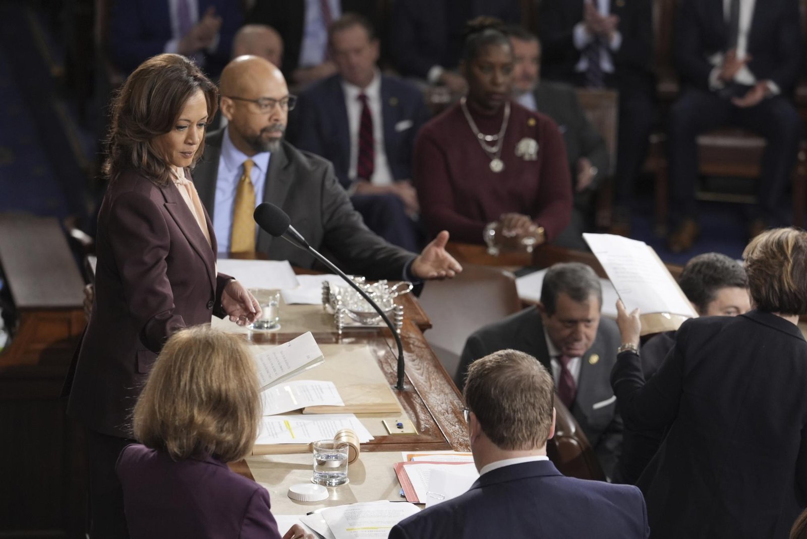 Se escuchó un suave aplauso para la Vicepresidenta Kamala Harris cuando llegó al pleno de la Cámara entre una multitud de asientos vacíos. Harris presidió la certificación de su derrota ante Trump, cuatro años después de que éste intentara detener el mismo proceso que ahora lo devolverá a la Casa Blanca.