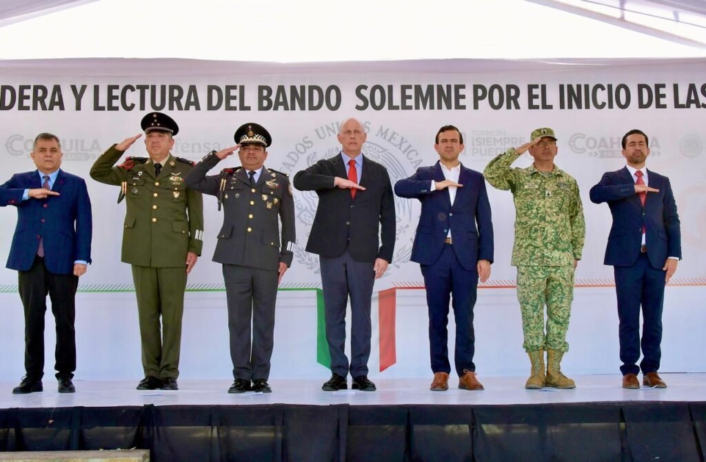 En representación del gobernador Manolo Jiménez Salinas asistió Gabriel Elizondo Pérez, coordinador general de Mejora Coahuila. También participaron el secretario del Ayuntamiento, Eduardo Olmos Castro; integrantes del Cabildo; y mandos de la XI Región Militar, el Mando Especial de La Laguna y la Guardia Nacional.