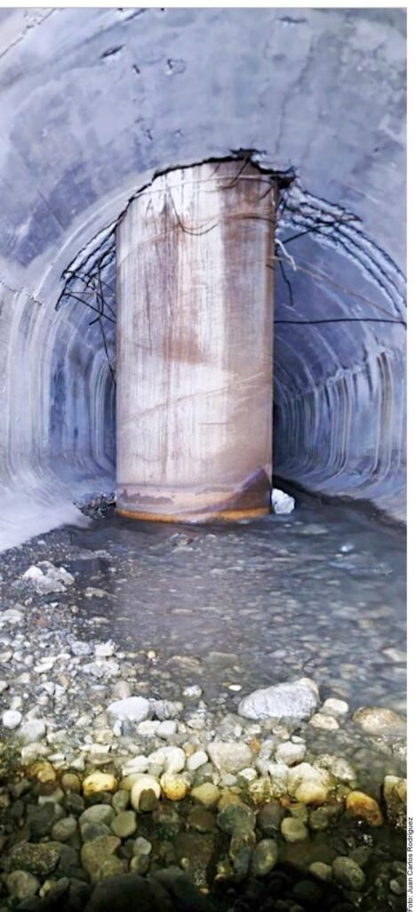 Acompañado de un especialista, un periodista de EL NORTE recorrió parte de este desagüe y localizó los siete pilotes que afectan el ducto, que es de 4 metros de diámetro y se localiza a poco más de seis metros de profundidad.