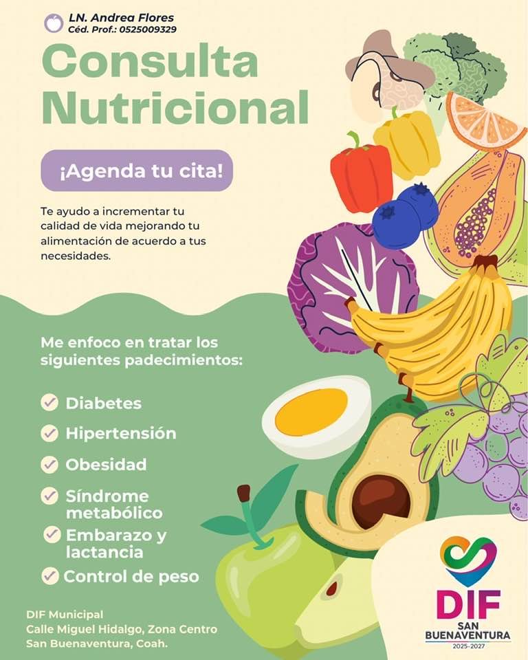El DIF Municipal de San Buenaventura ha puesto a disposición de la ciudadanía los servicios de una nutrióloga especializada, reafirmando su compromiso con el bienestar de la comunidad bajo el lema “¡Tu salud también es nuestra prioridad!”. Esta iniciativa busca ofrecer herramientas profesionales para que las familias del municipio puedan mejorar sus hábitos y su calidad de vida.