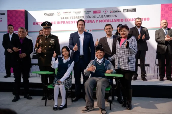 En el marco del Día de la Bandera, Javier Díaz y el coordinador general de Mejora Coahuila, Gabriel Elizondo Pérez, entregaron infraestructura y mobiliario educativo dentro del eje “Mejora tu Escuela”, beneficiando a estudiantes y docentes de la secundaria.