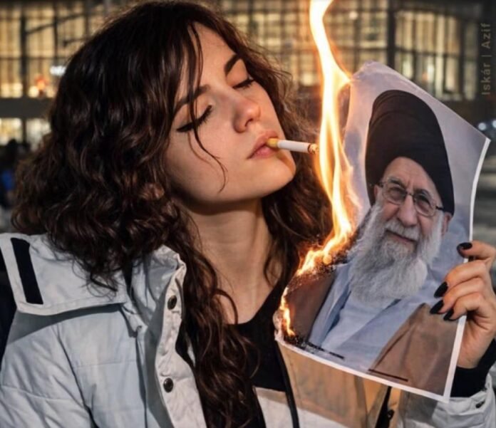Una imagen ampliamente compartida de una joven iraní usando un retrato en llamas del líder supremo Ali Khamenei para encender un cigarrillo se ha vuelto viral como símbolo de desafío en las últimas protestas en Irán.